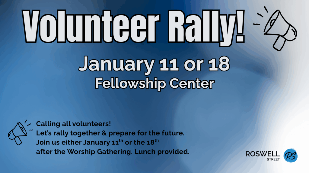 All Roswell Street volunteers are invited to join us for lunch and fellowship and a word from Pastor Christian. This event will be offered on Sunday, January 11 and 18 after the Worship Gathering. Choose the one date that works best for you.